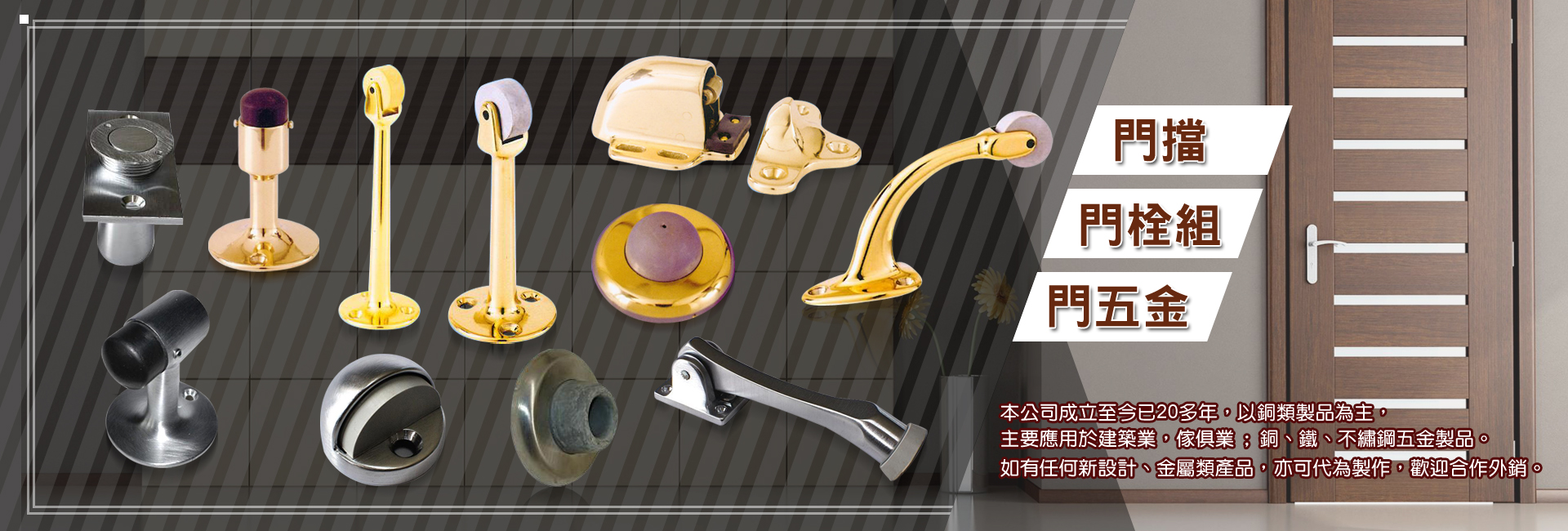 主要產品:建築五金的製作、包裝,如門擋、把手、窗扣。